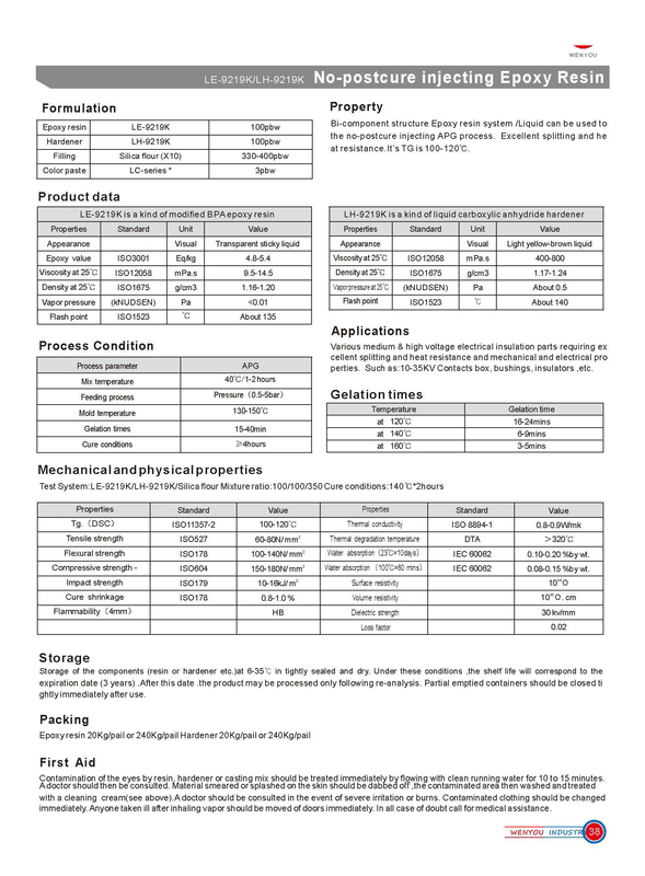 Bu iki bileşenli epoksi reçine sistemi (sıvı) APG ve vakum altındaki geleneksel döküm süreçleri için tasarlanmıştır.100-120 °C arasında bir TG aralığı ile mükemmel parçalanma direnci ve ısı direnci ile karakterizedir.